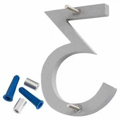 Cast in recycled aluminum this elegant modern house number will enhance the curb appeal of your home or business for years to come. Mounting hardware for concealed flat mount and spacers for 0.5 in. floating mount are both included. Once finished this number is placed in a polishing mixture for 14-hours to bring out the desired appearance. Mounting Instructions and template are located on website.
