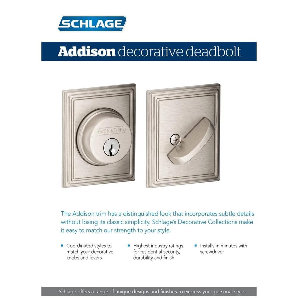 The Schlage Addison Matte Black Single Cylinder Deadbolt is perfect for use on exterior doors and adds an extra layer of security to your exterior handleset or knob/knob. The Addison trim’s distinguished look incorporates subtle details without losing its classic simplicity. When finished in Matte Black, the deadbolt looks especially elegant. Plus, it’s been designed and tested with strength and durability in mind.