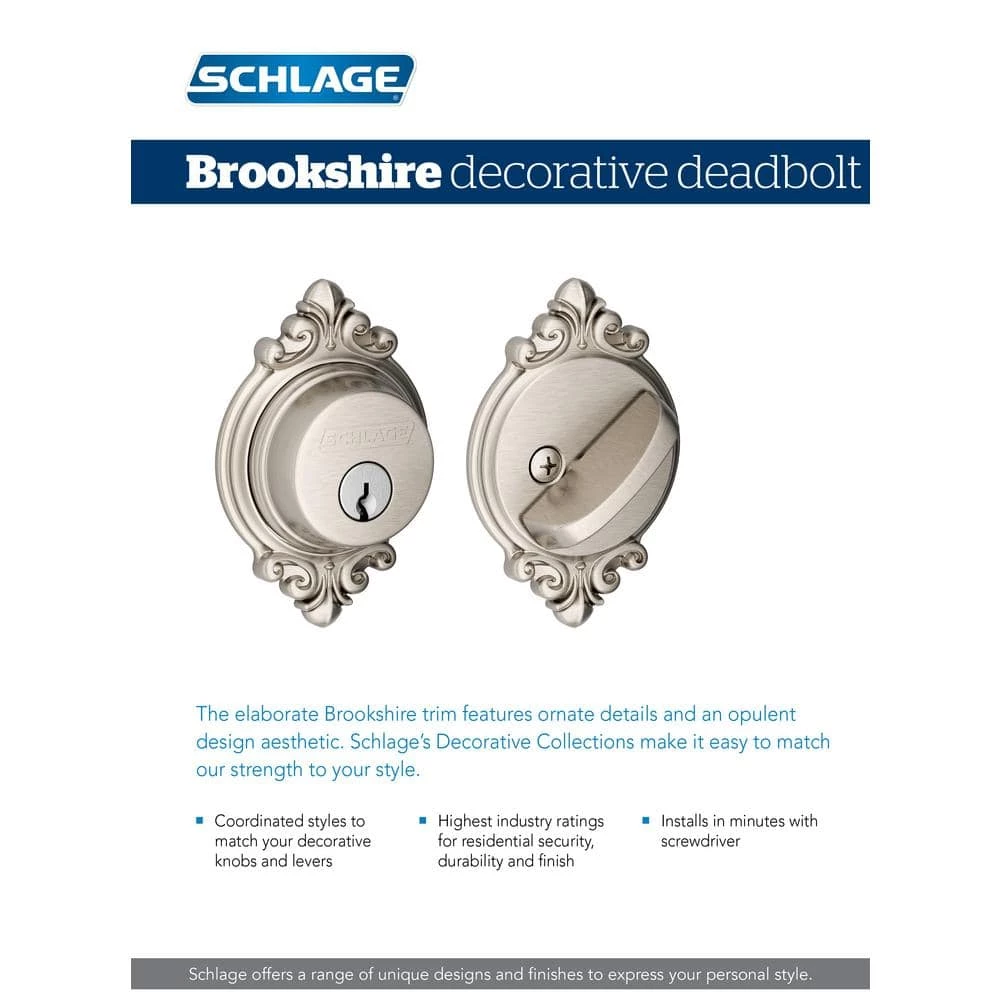 The Schlage Brookshire Aged Bronze Single Cylinder Deadbolt is perfect for use on exterior doors and adds an extra layer of security to your exterior handleset or knob/knob. The elaborate Brookshire trim features ornate details and an opulent design aesthetic. When finished in Aged Bronze, the deadbolt features warm, copper tones that break through a darker, aged exterior. Plus, it’s been designed and tested with strength and durability in mind.