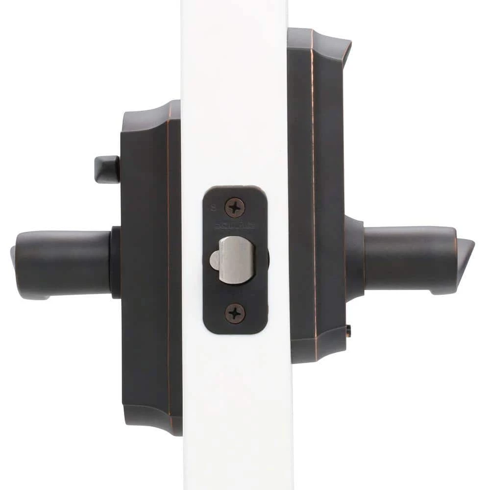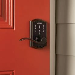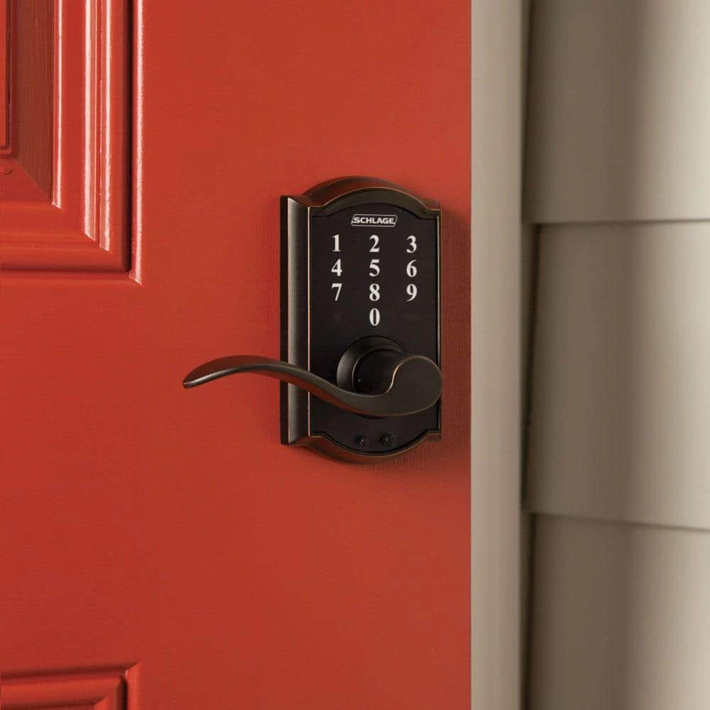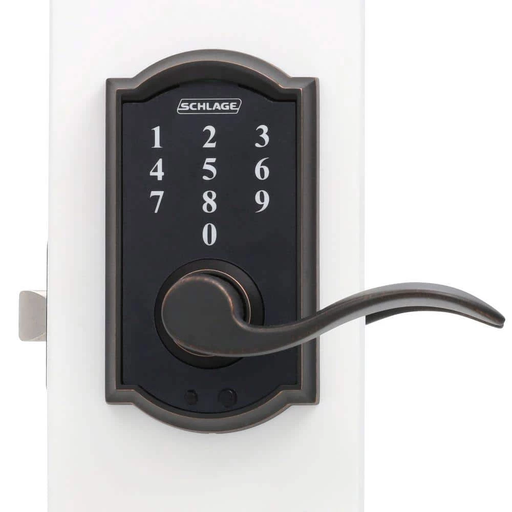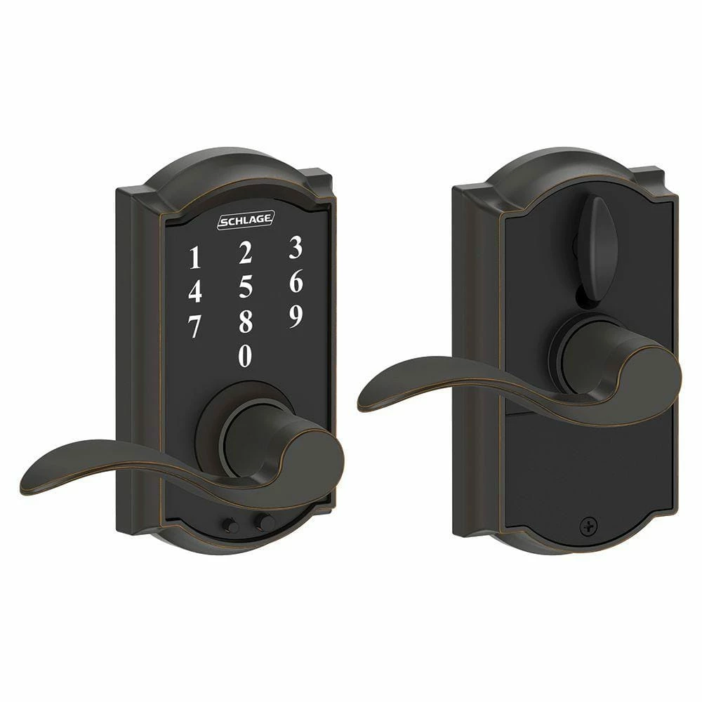 Eliminate the hassle of house keys with the Schlage Accent Aged Bronze Touch Electronic Door Lever with Camelot Trim. There’s no key to lose, no re-keying or cutting new keys – no keys at all, thanks to our cylinder-free design. The LED backlight keypad is able to hold up to 19 different user codes for your convenience, and is fingerprint resistant. Also, this electronic door lever runs on a single 9-volt battery, which is included. All in a slim profile and stylish trim that pairs perfectly with interior hardware. The Accent lever is widely popular for its elegant wave-like design that effortlessly matches a home’s style without overshadowing it, while the Camelot trim’s scalloped architectural details add charm to any home. Our Aged Bronze finish is inspired by traditional design, featuring warm, copper tones that break through its darker, aged exterior. Plus, it’s been designed and tested with strength and durability in mind.