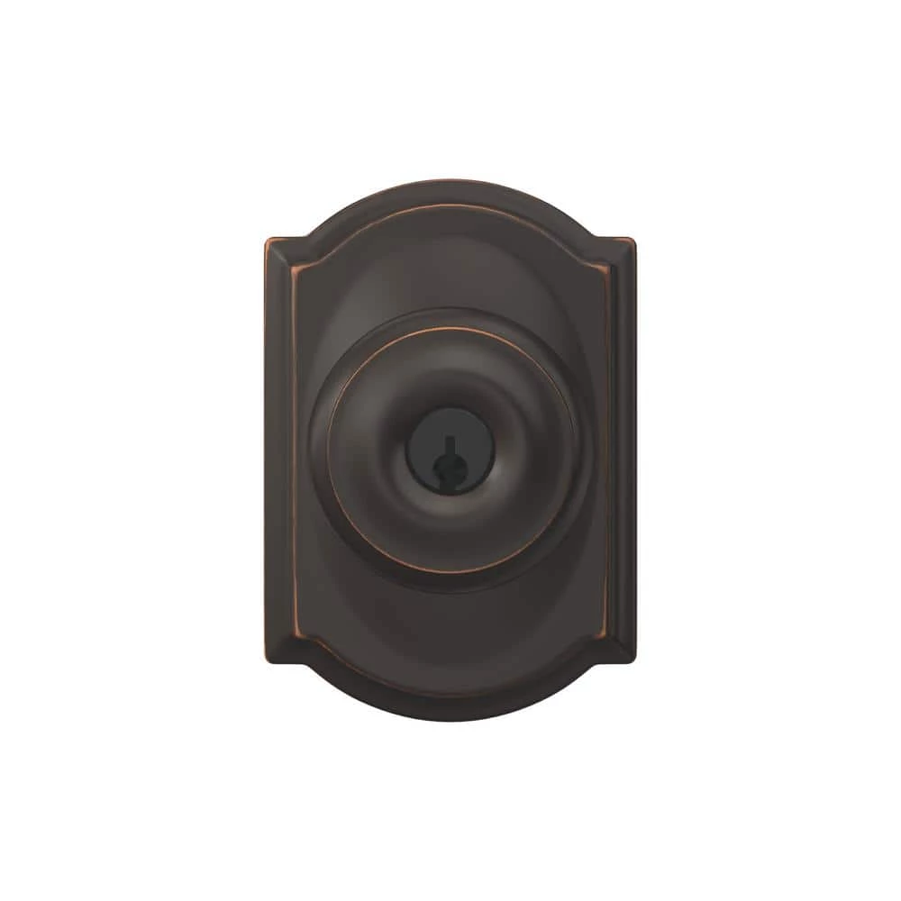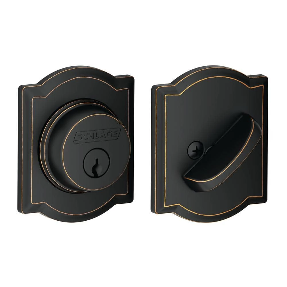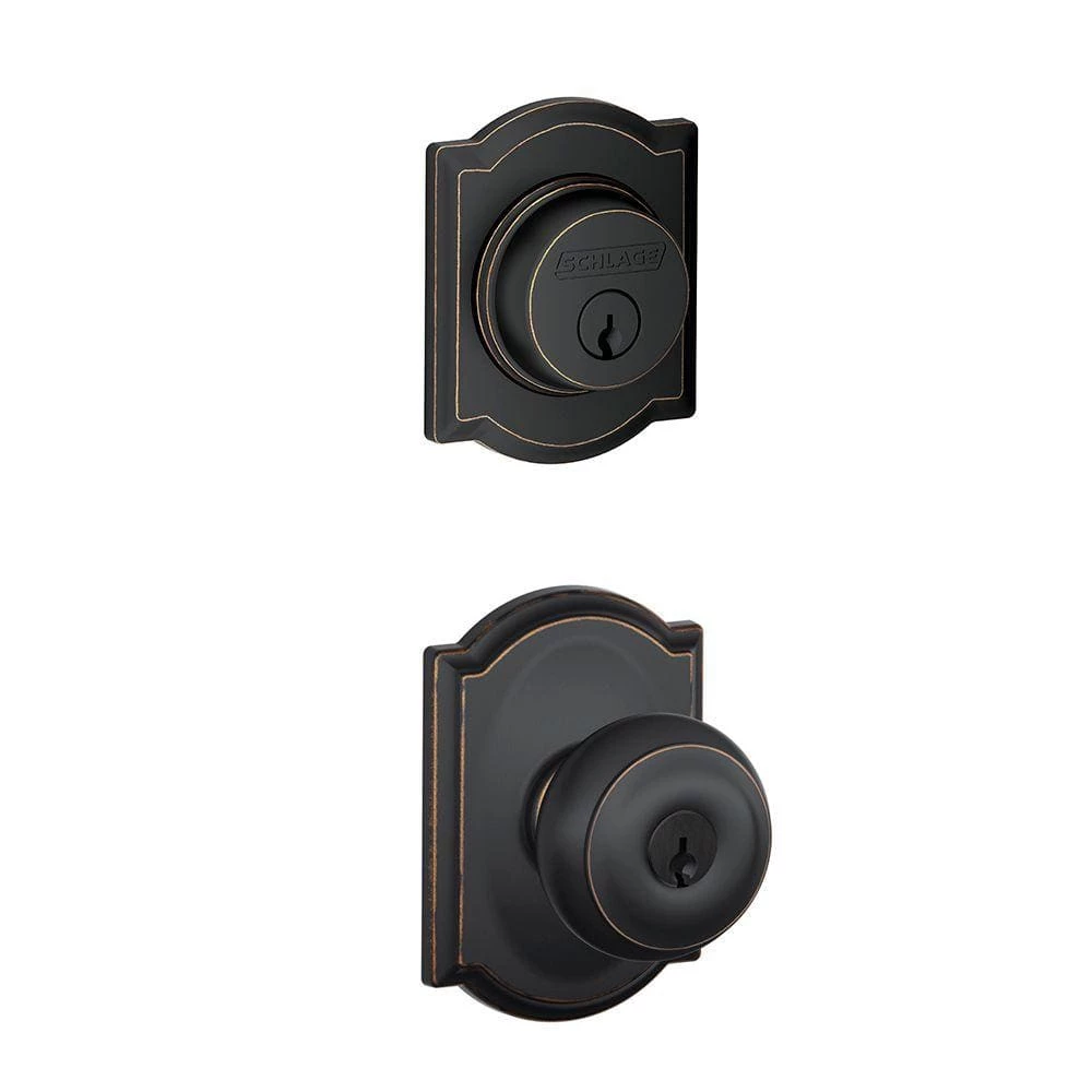 The Schlage Camelot Aged Bronze Single Cylinder Deadbolt with Georgian Entry Door Knob Combo Pack is perfect for use on exterior doors where extra security is needed. The Georgian knob design features classically inspired details for timeless appeal, and the deadbolt adds an extra layer of Grade 1 security. Its Aged Bronze finish features warm, copper tones that break through its darker, aged exterior. The knob unlocks when the door is opened from the inside, allowing you to leave quickly and conveniently and re-enter easily. Plus, it was designed and tested with strength and durability in mind.