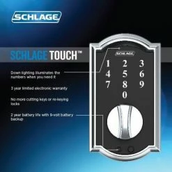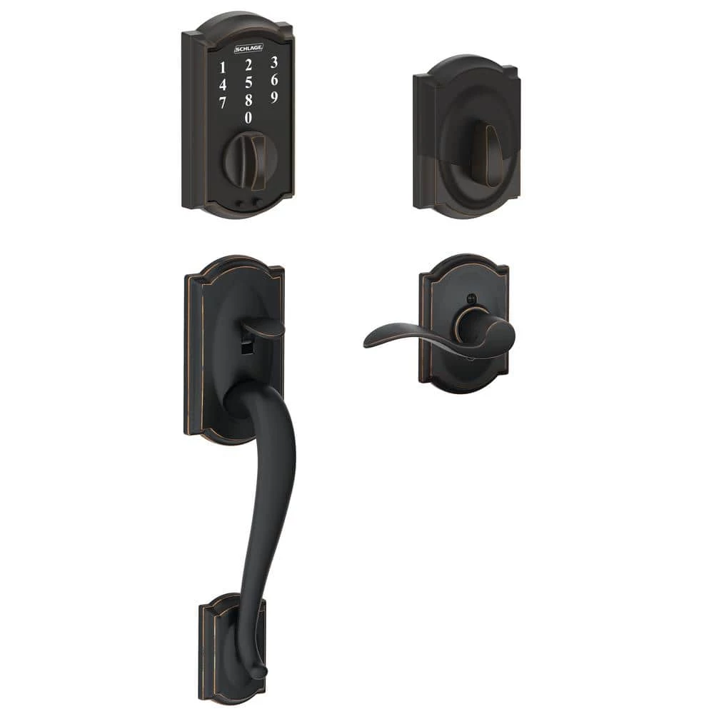 With the Schlage Camelot Aged Bronze Touch Electronic Deadbolt and Front Entry Door Handle with Accent Door Lever, there’s no key to lose, no re-keying or cutting new keys – no keys at all, thanks to our cylinder-free design. You can finally go for a run or take the dog for a walk without juggling keys or stuffing them in your sock. All in a slim profile and stylish trim that pairs perfectly with interior hardware. The Camelot trim’s scalloped architectural details make any room charming and approachable, especially when wrapped in our versatile Satin Nickel finish. Plus, it’s been designed and tested with strength and durability in mind.