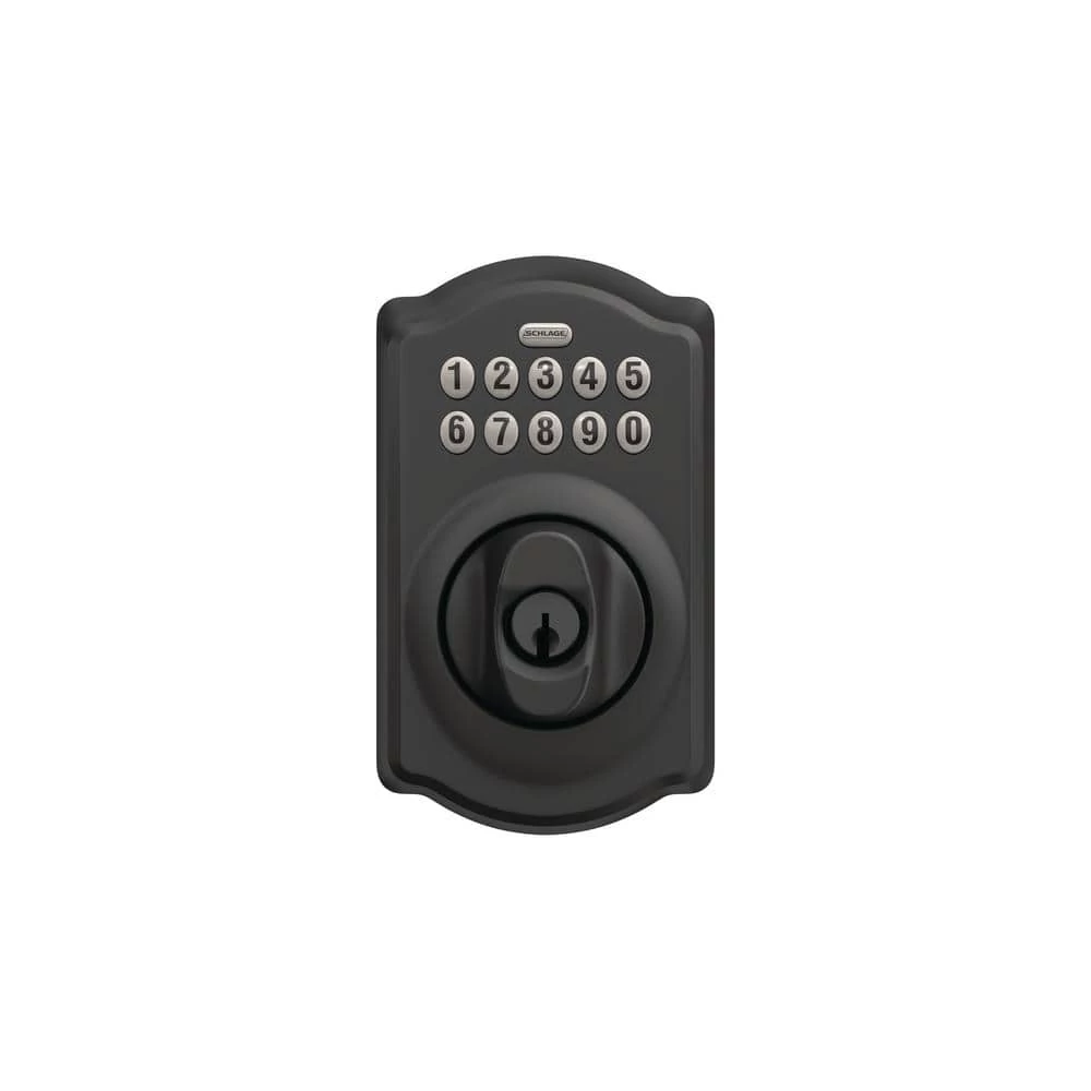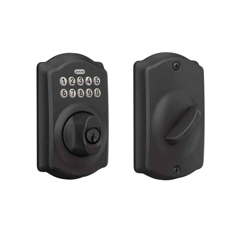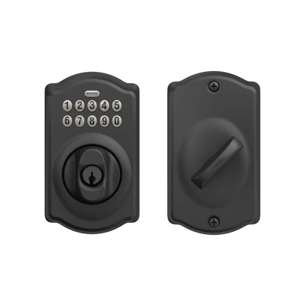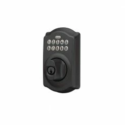The Schlage Keypad Deadbolt with Camelot Trim in Matte Black is perfect for use on front doors, garage entry doors, and side and back doors. With a keypad deadbolt, you can control entry to your home more easily and securely. No more hiding keys under the doormat or losing track of copies – just use access codes that can be created or deleted in seconds. The Camelot trim’s scalloped architectural details add charm to any home, while the striking appearance of the Matte Black finish creates an elegant look that’s sure to be noticed in any style setting. Plus, it’s been designed and tested with strength and durability in mind.