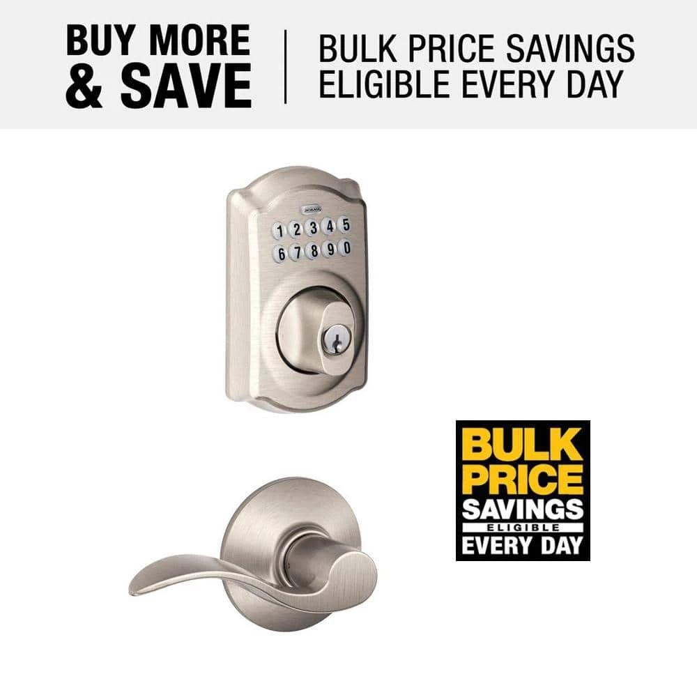 Upgrade your exterior door’s convenience and curb appeal with the Schlage Camelot Satin Nickel Keypad Electronic Deadbolt and Accent Door Lever. The Schlage keypad combo pack contains a satin nickel keypad deadbolt with one hall and closet accent lever. Schlage has built a legacy of providing the highest level of security to homes and businesses. Install a Schlage, and you install nearly a century of total dedication to security, quality and innovation.