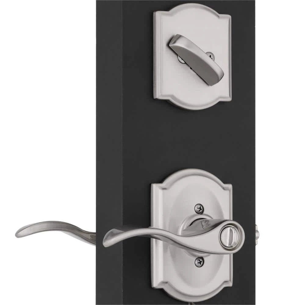 The Schlage Camelot Satin Nickel Single Cylinder Deadbolt with Accent Entry Door Lever Combo Pack is perfect for use on exterior doors where extra security is needed. The Accent lever features an elegant wave-like design that effortlessly matches any room’s style, and the deadbolt adds an extra layer of Grade 1 security. When finished in Satin Nickel, the lever offers a tasteful and flattering accent to any home. The lever unlocks when the door is opened from the inside, allowing you to leave quickly and conveniently and re-enter easily. Plus, it was designed and tested with strength and durability in mind.