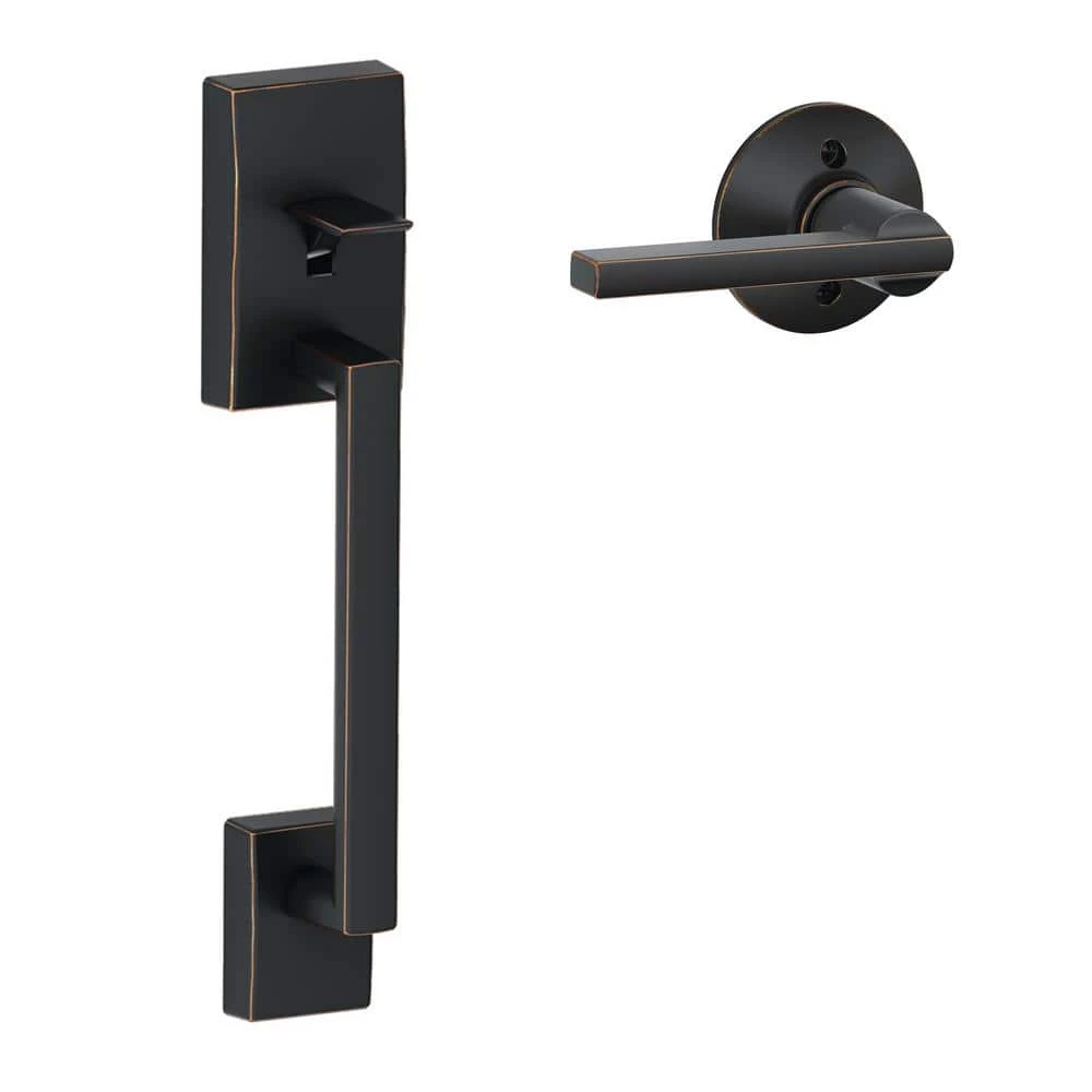 The Schlage Century Lower Half Handleset and Latitude Lever in Aged Bronze is perfect for use with an electronic deadbolt for a complete front entry set. The Latitude lever offers a crisp perspective on minimalist design with its clean lines and rectangular features. Our Aged Bronze finish is inspired by traditional design, featuring warm, copper tones that break through its darker, aged exterior. Plus, it’s been designed and tested with strength and durability in mind.
