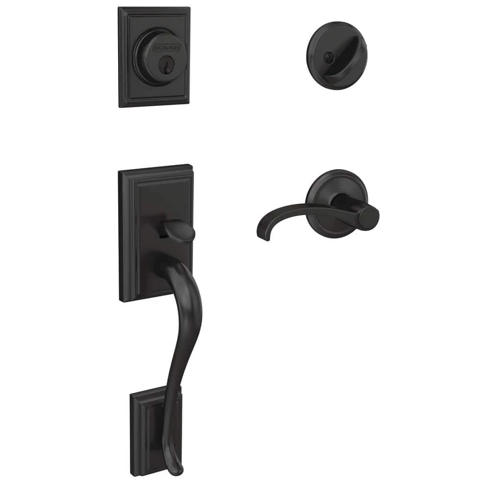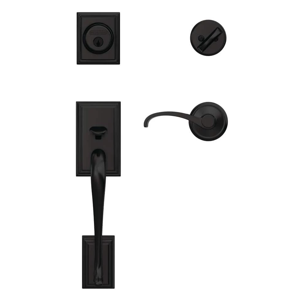 The ultimate in entryway style, the Schlage Custom Addison Single Cylinder Handleset and Interior Whitney Lever with Alden Trim in Matte Black makes your front door unforgettable. Low profile interior trim creates a high-style designer look. The Whitney lever adds an authentic touch of traditional style reminiscent of classic wrought-iron scrollwork, while the Addison grip’s distinguished look incorporates subtle details without losing its classic simplicity. The striking appearance of the Matte Black finish creates an elegant look that’s sure to be noticed in any style setting. Coordinate the style and finish of your homes door hardware inside and out by pairing with Schlage Custom interior door hardware.