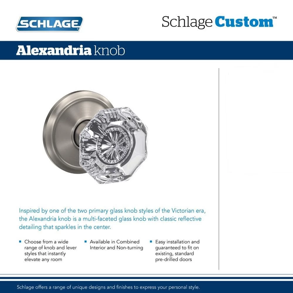 The Schlage Custom Alexandria Glass Knob with Camelot Trim Passage and Privacy Lock in Satin Nickel is uniquely designed to work on both Hall/Closet and Bed/Bath doors. It’s easy to switch between locking and non-locking functions. Just insert or remove the locking pin from the pinhole on the interior side of the hardware. Schlage Custom hardware is also designed with premium style in mind, featuring low profile trim and concealed screws for a more polished look. Inspired by the Victorian era, the Alexandria glass knob is multi-faceted with classic detailing sparkling in the center, while the Camelot trim’s scalloped architectural details make any room charming and approachable – especially when wrapped in our versatile Satin Nickel finish.