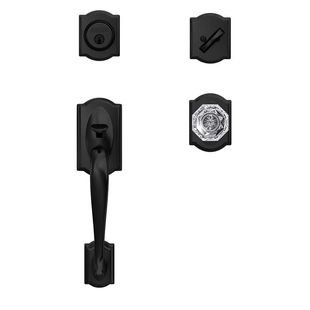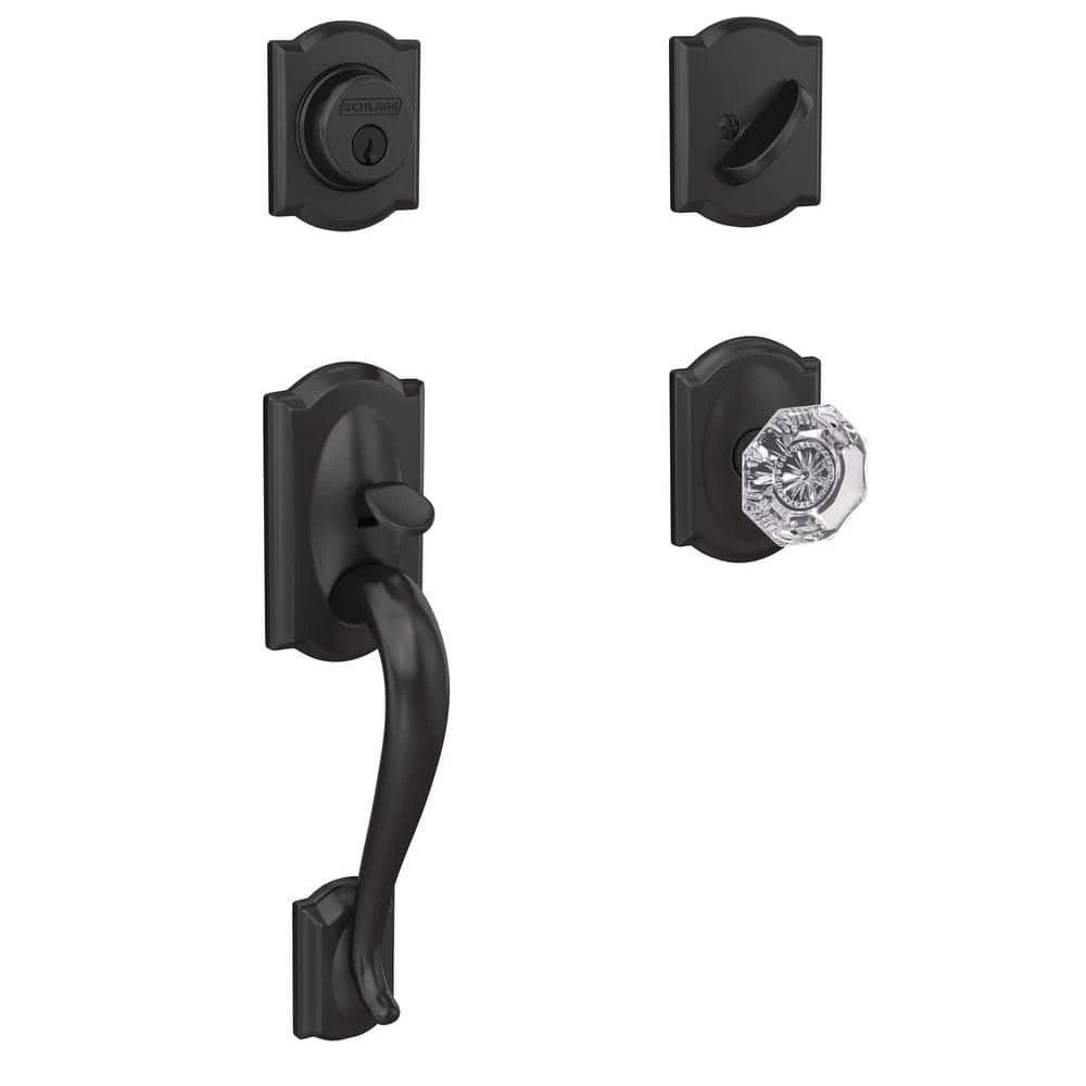 The ultimate in entryway style, the Schlage Custom Camelot Single Cylinder Handle set and Interior Alexandria Glass Knob with Camelot Trim in Matte Black makes your front door unforgettable. Low profile interior trim creates a high-style designer look. Inspired by the Victorian era, the Alexandria glass knob is multi-faceted with classic detailing sparkling in the center, while the Camelot grip trim’s scalloped architectural details make any room charming and approachable. The striking appearance of the Matte Black finish creates an elegant look that trim’s sure to be noticed in any style setting. Coordinate the style and finish of your homes door hardware inside and out by pairing with Schlage Custom interior door hardware.