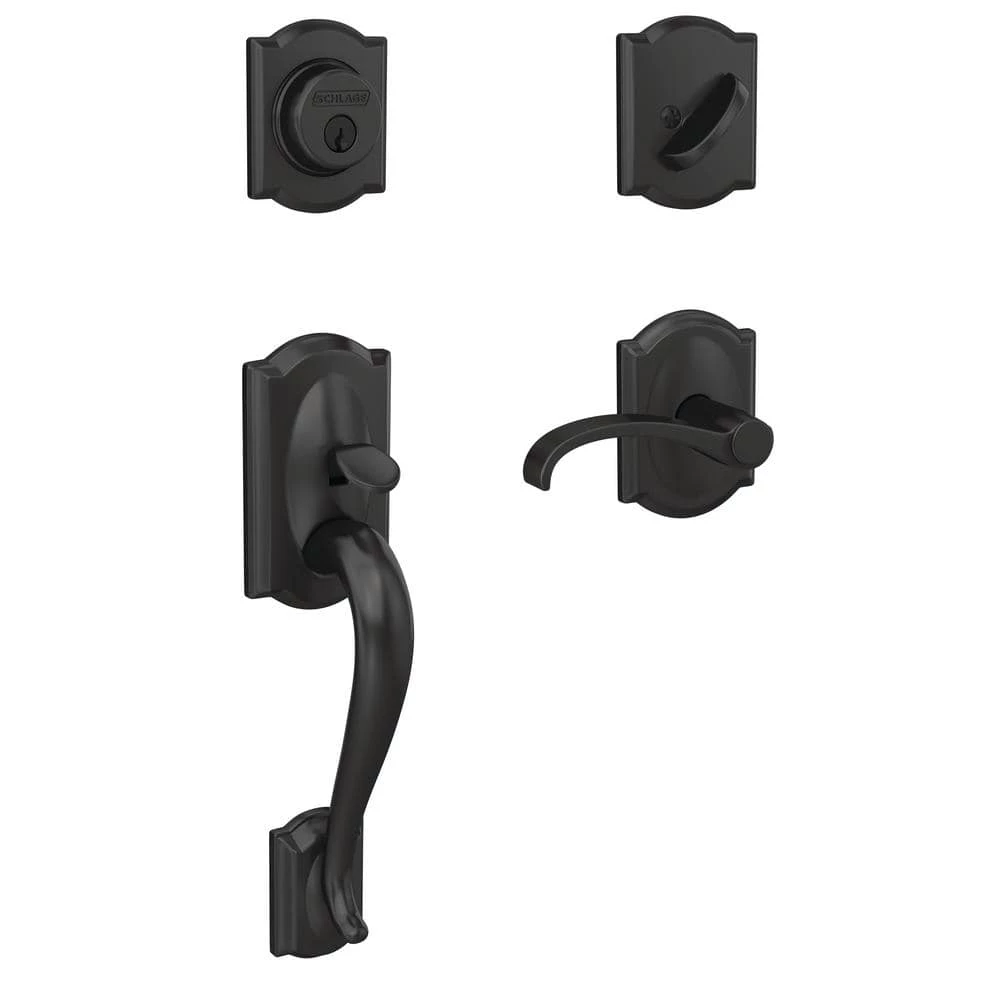 The ultimate in entryway style, the Schlage Custom Camelot Single Cylinder Handleset and Interior Whitney Lever with Camelot Trim in Matte Black makes your front door unforgettable. Low profile interior trim creates a high-style designer look. The Whitney lever adds an authentic touch of traditional style reminiscent of classic wrought-iron scrollwork, while the Camelot grip’s scalloped architectural details make any room charming and approachable. The striking appearance of the Matte Black finish creates an elegant look that’s sure to be noticed in any style setting. Coordinate the style and finish of your homes door hardware inside and out by pairing with Schlage Custom interior door hardware.