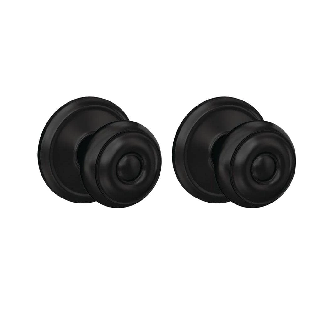 The Schlage Custom Georgian Matte Black Dummy Door Knob with Alden Trim is uniquely designed with premium style in mind, featuring low profile trim and concealed screws for a more polished look. Schlage Custom dummy hardware comes in pairs, making it perfect for French doors. The modest Georgian knob features symmetrical detailing throughout. The striking appearance of the Matte Black finish creates an elegant look that’s sure to be noticed in any style setting.