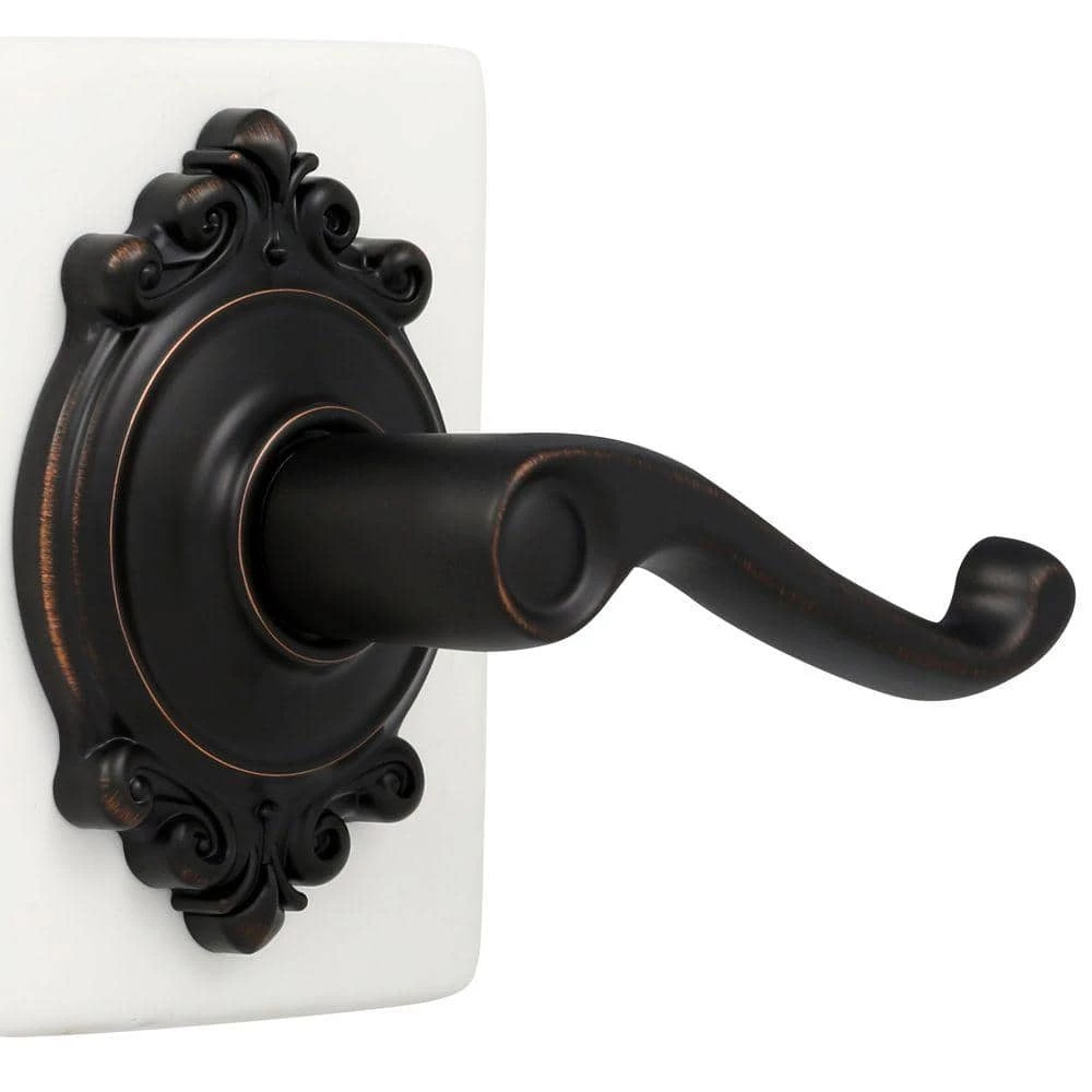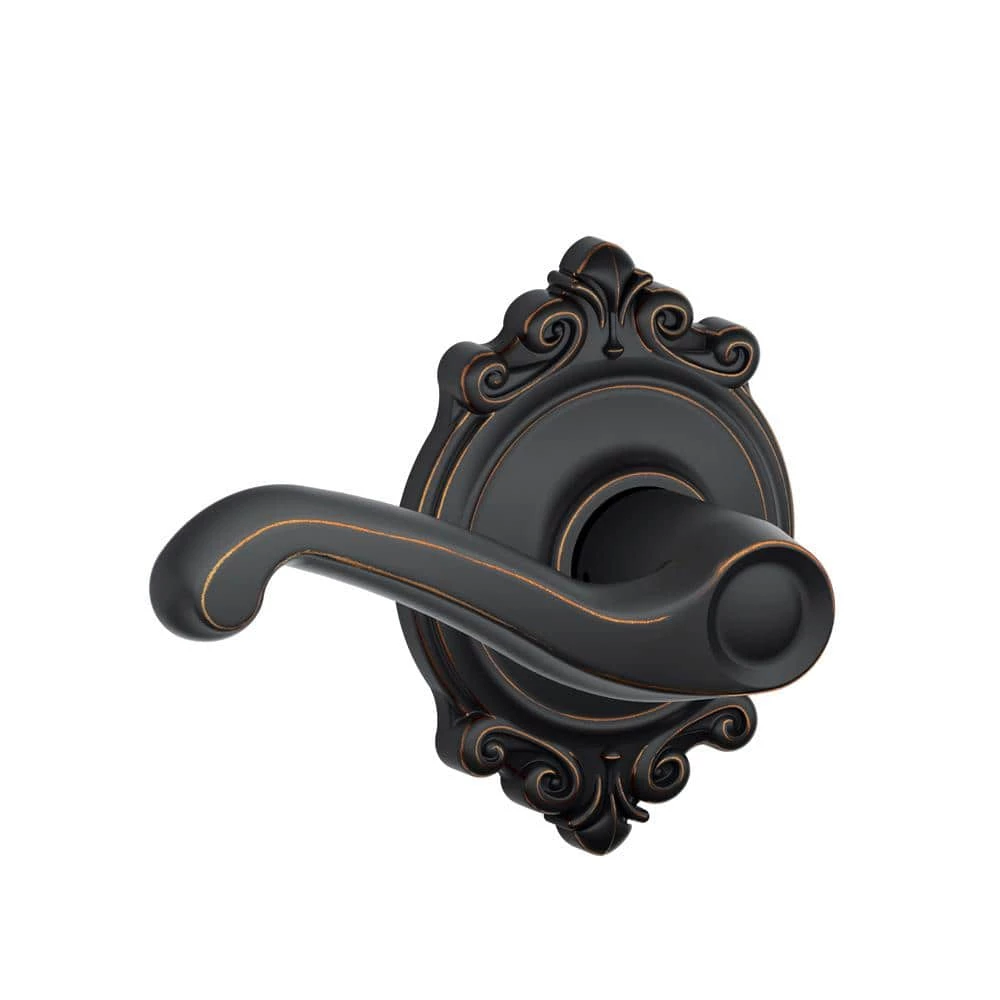 The Schlage Flair Aged Bronze Passage Door Lever with Brookshire Trim is perfect for use on hall and closet doors where locking is not needed. The elegant Flair lever’s ornate details are reminiscent of a paper scroll. The elaborate Brookshire trim features ornate details and an opulent design aesthetic. The Aged Bronze finish is inspired by traditional design, featuring warm, copper tones that break through its darker, aged exterior. The universal design of this passage door lever set allows it to be mounted to left or right swing doors. Plus, it’s been designed and tested with strength and durability in mind.