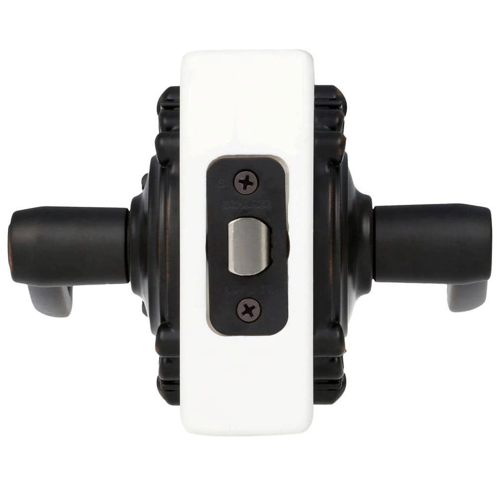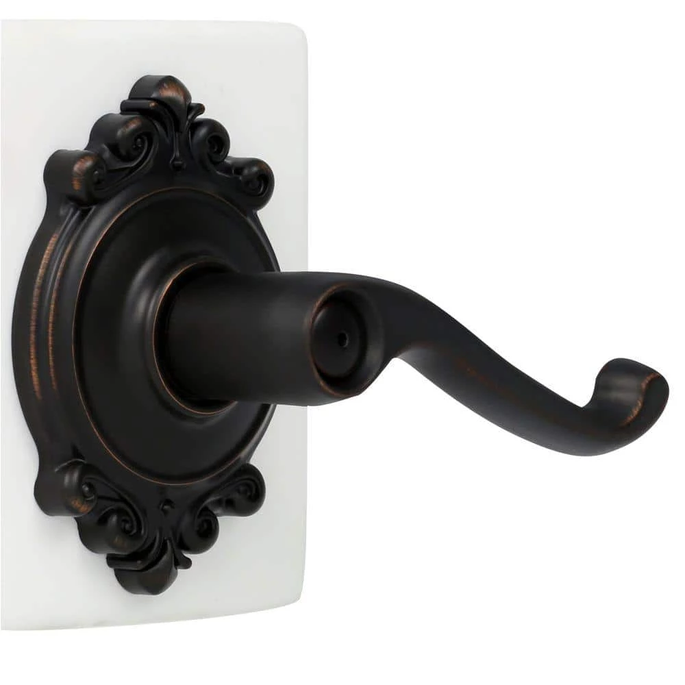 The Schlage Flair Aged Bronze Privacy Door Lever with Brookshire Trim is perfect for interior doors where locking is needed, such as bedroom and bathroom doors. The Flair Lever features a traditional scroll design that adds a sense of charm to any decor, and the Brookshire trim’s design brings an ornate and elegant appearance to your door. Our Aged Bronze finish is inspired by traditional design, featuring warm, copper tones that break through its darker, aged exterior. Its universal design allows it to be mounted to left or right swing doors.