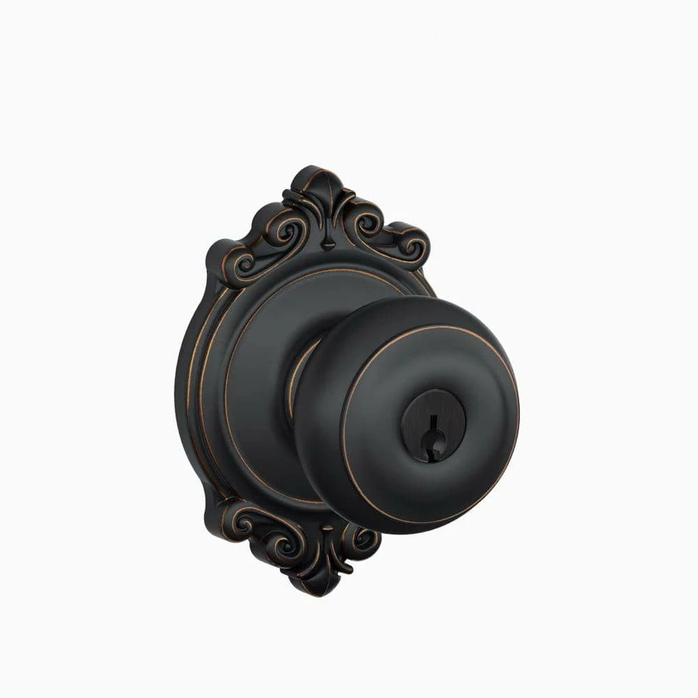 The Schlage Georgian Aged Bronze Keyed Entry Door Knob with Brookshire Trim is perfect of use on exterior doors. The modest Georgian knob features symmetrical detailing throughout, while the Brookshire trim’s design brings an ornate and elegant appearance to your door. Our Aged Bronze finish features warm, copper tones that break through its darker, aged exterior. The knob unlocks when the door is opened from the inside, allowing you to leave quickly and conveniently and re-enter easily. Plus, it was designed and tested with strength and durability in mind.