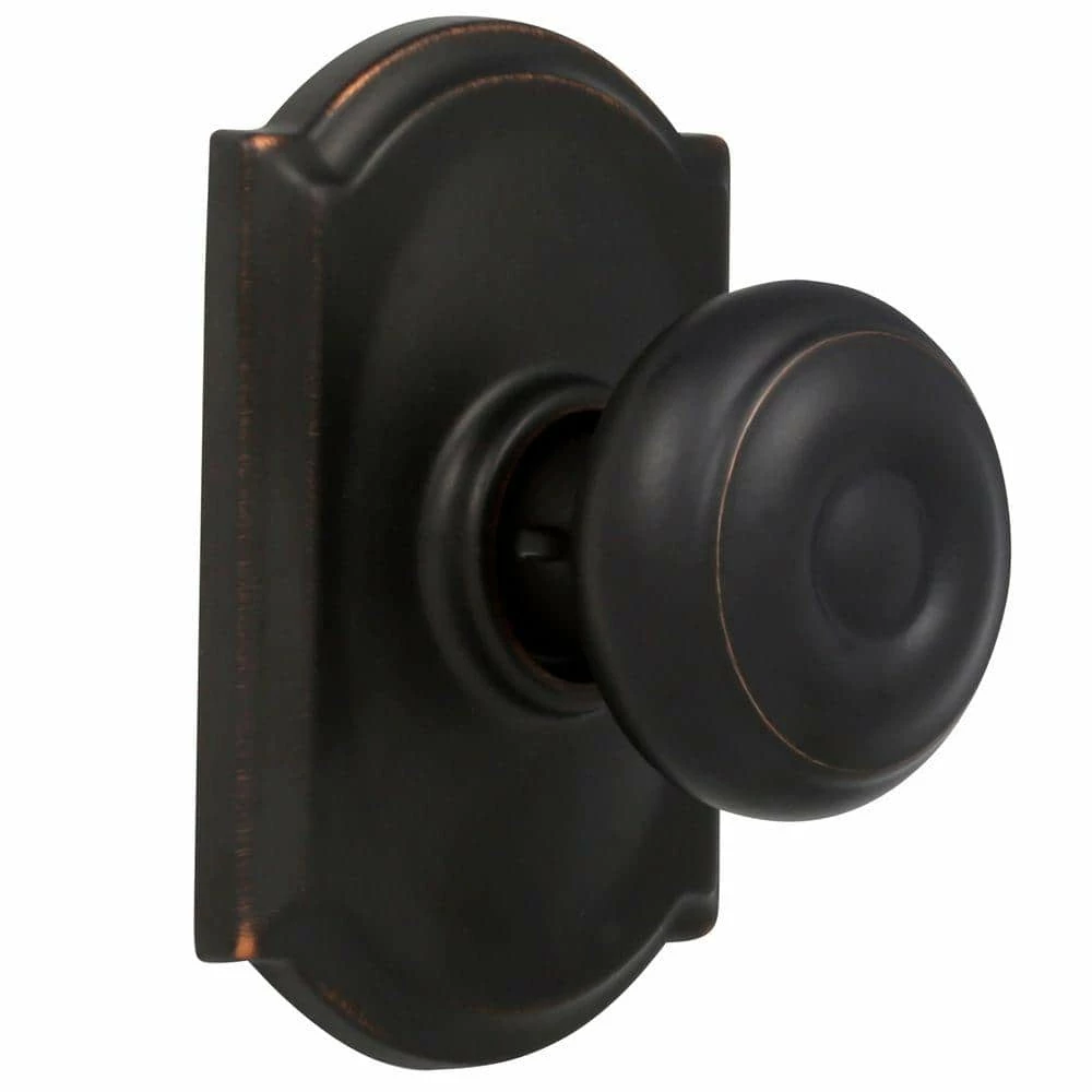 The Schlage Georgian Aged Bronze Hall and Closet Knob exhibits warm, copper tones that break through its darker, aged exterior. Perfect for latching interior doorways that do not need to be locked, this flat-ball doorknob features a Camelot escutcheon designed to bring an air of nostalgia and charm to any home. The universal design allows it to be mounted to left or right swing doors and the finish coordinates nicely with other aged bronze fixtures in your house for a cohesive look. The workmanship and lustrous finish are protected by a lifetime limited warranty, certain to provide decades of dependable use and allure.