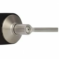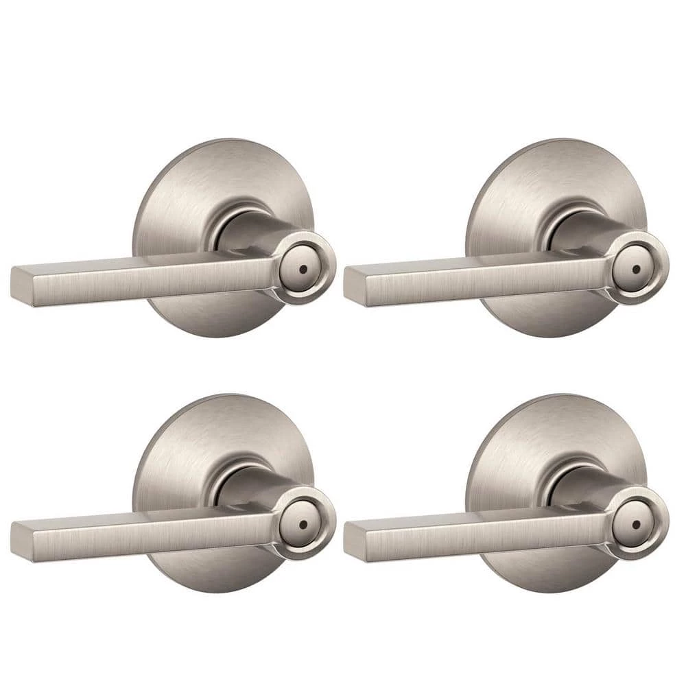 Add a crisp element to your interior with this Schlage privacy lock door lever (4-Pack). It is ideal for bedrooms or bathrooms where a locking function is necessary. Featuring clean lines and rectangular structure, this lever of solid brass and a versatile satin nickel finish pairs well with contemporary and urban decors. Its universal design works with right and left swing doors with a 1-3/8 in. to 1-3/4 in. thickness. Installation with a Phillips screwdriver takes minutes, and this durable door lever features a push lock for additional privacy. The universal latch slides into place without the need for tools or manual adjustments.