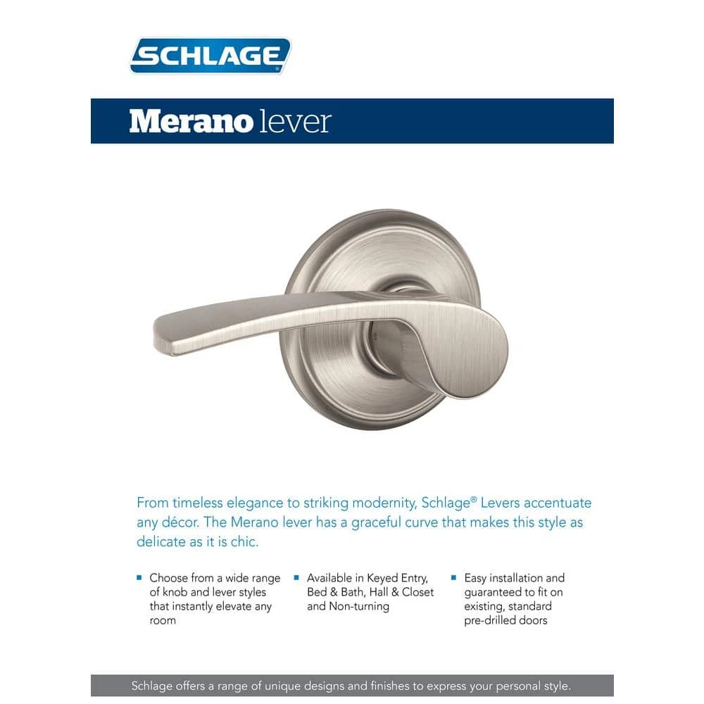 The Schlage Merano Satin Nickel Privacy Door Lever is perfect for interior doors where locking is needed, such as bedroom and bathroom doors. The Merano lever has a graceful curve that makes it as delicate as it is chic – especially when wrapped in our versatile Satin Nickel finish. Its universal design allows it to be mounted to left or right swing doors. Plus, it’s been designed and tested with strength and durability in mind.