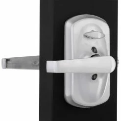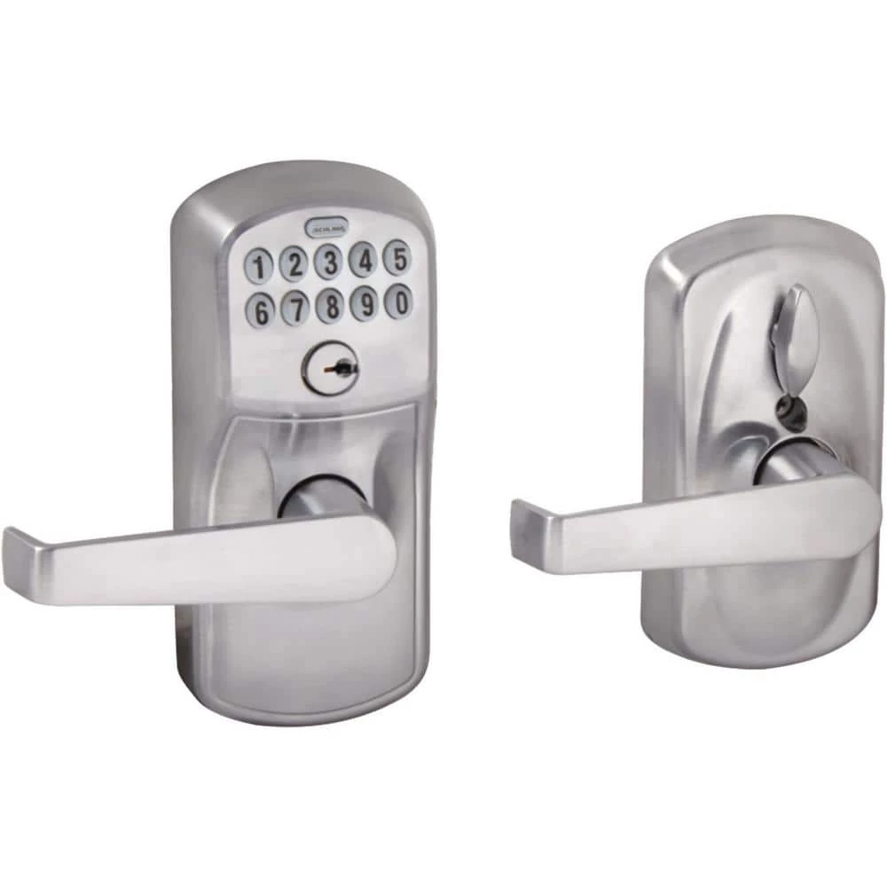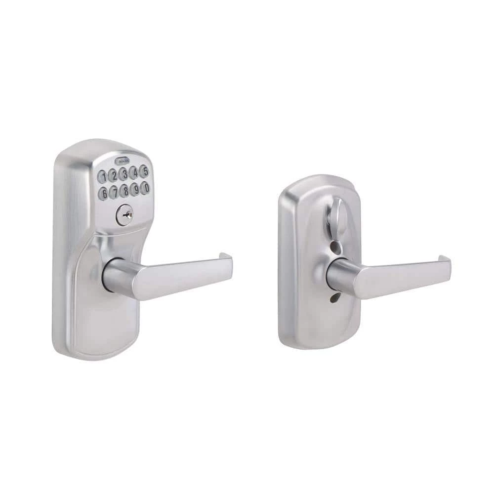 Eliminate the hassle of house keys with the Schlage Elan Satin Chrome Keypad Electronic Door Lever with Plymouth Trim Featuring Flex Lock. With this electronic door lever, you can control entry to your home more easily and securely, and our Flex-Lock feature allows you to set the lock to automatically re-lock after 5 seconds of inactivity. The LED backlight keypad is able to hold up to 19 different user codes for your convenience, and features a low battery indicator. Also, this electronic keypad runs on a single 9-volt battery, which is included. All in a slim profile and stylish trim that pairs perfectly with interior hardware. The Elan lever is sturdy and modest, while the Plymouth trim features an oval shape and straightforward design. The lock becomes especially edgy when finished in Satin Chrome. Plus, it’s been designed and tested with strength and durability in mind.