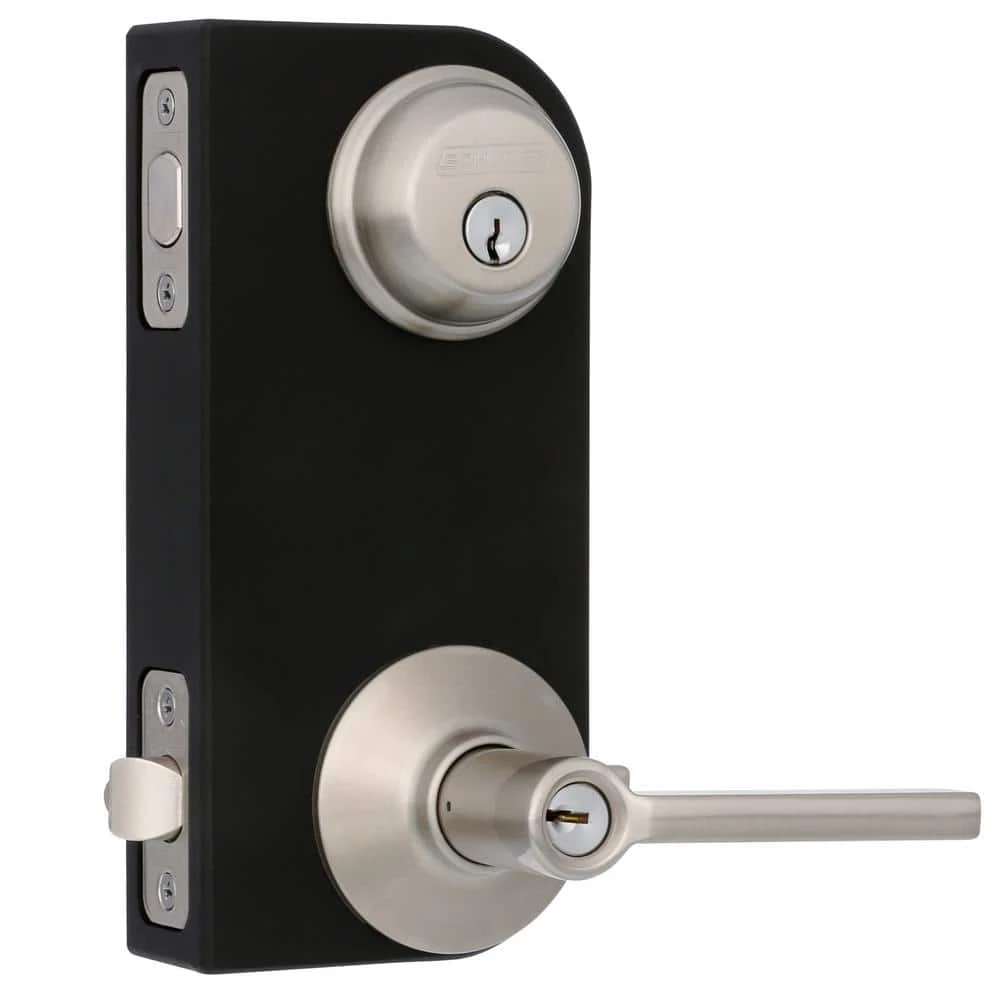 The Schlage Satin Nickel Single Cylinder Deadbolt with Latitude Entry Door Lever Combo Pack is perfect for use on exterior doors where extra security is needed. The Latitude lever offers a crisp perspective on minimalist design with its clean lines and rectangular features. The warm silver tones of Satin Nickel complement light and dark wood grains in addition to a broad spectrum of colors. The lever unlocks when the door is opened from the inside, allowing you to leave quickly and conveniently and re-enter easily. Plus, it was designed and tested with strength and durability in mind.